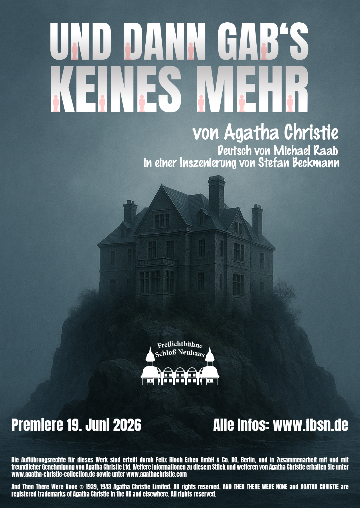 Die Aufführungsrechte für dieses Werk sind erteilt durch Felix Bloch Erben GmbH & Co. KG, Berlin, und in Zusammenarbeit mit und mit freundlicher Genehmigung von Agatha Christie Ltd. Weitere Informationen zu diesem Stück und weiteren von Agatha Christie erhalten Sie unter www.agatha-christie-collection.de sowie unter www.agathachristie.com